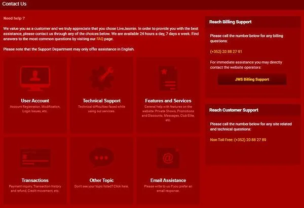 Η LiveJasmin προσφέρει κορυφαία υποστήριξη πελατών για να εξασφαλίσει μια ομαλή εμπειρία στους χρήστες της. Με μια ολοκληρωμένη ενότητα FAQ για γρήγορη αναφορά, τα μέλη μπορούν εύκολα να βρουν απαντήσεις σε συχνές ερωτήσεις. Επιπλέον, η LiveJasmin παρέχει 24/7/365 υποστήριξη μέσω email, τηλεφώνου και live chat, εξασφαλίζοντας ότι η βοήθεια είναι πάντα προσβάσιμη.