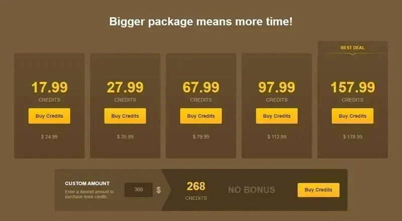 Ook al kost het misschien veel tijd om zo'n grote hoeveelheid credits op te maken, ik raad je echt aan om een groter pakket te kopen als je het kunt veroorloven. Zo krijg je meer bonuscredits. Uit mijn ervaring zul je spijt krijgen van het geld dat je had kunnen besparen als je dat niet doet.