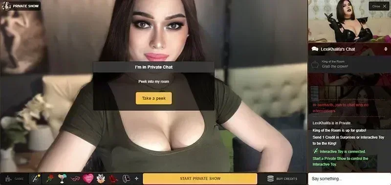 De site geeft je 10 GRATIS PEEKS als je voor het eerst lid wordt. Een peek is een blik van 20 seconden in een privéshow die op dat moment bezig is. Wacht tot de show goed op gang is voordat je stiekem een kijkje neemt bij een model dat gezellig met haar nieuwe vriend praat. Leden die sitecredits hebben verdiend, kunnen blijven meekijken in shows voor één credit per keer.