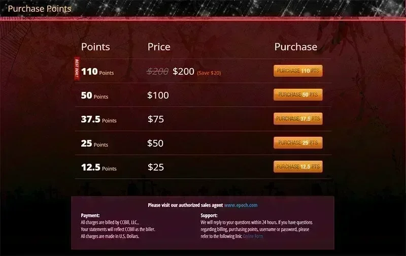CCBill regelt de betalingen. Gebruik een MasterCard, Visa, Discover of JCB om punten te kopen.